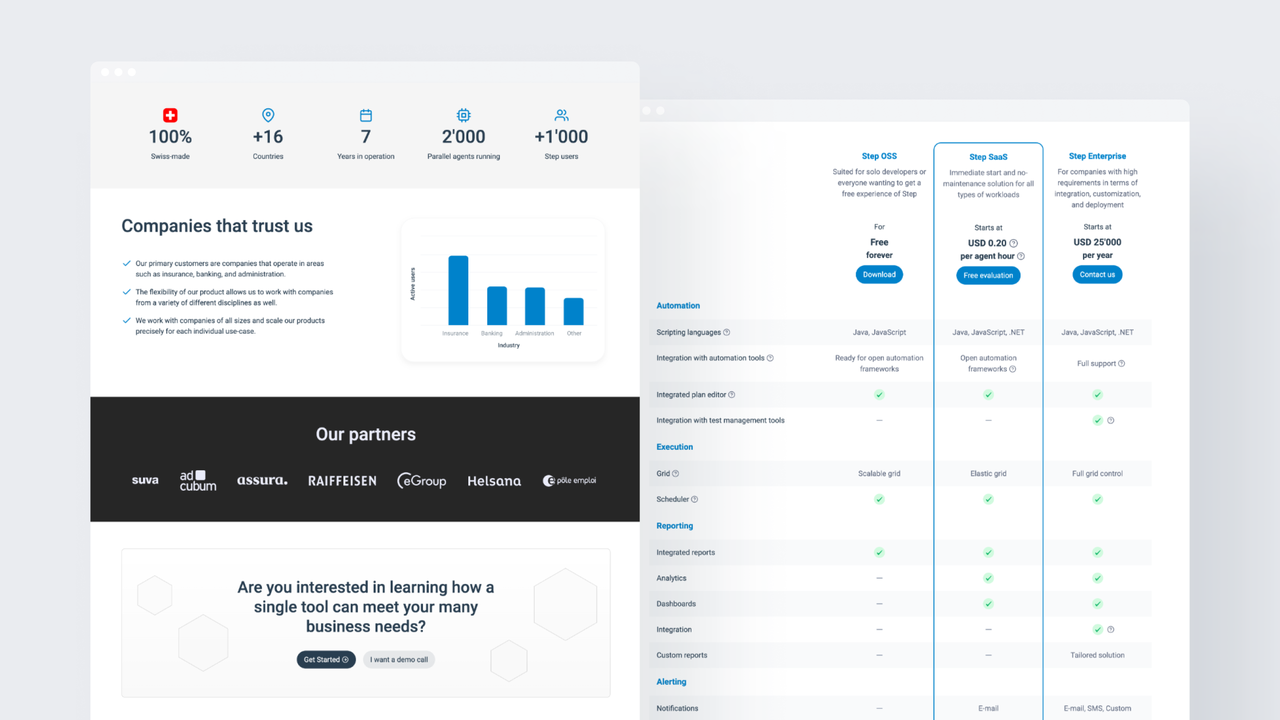 We designed and developed a marketing site entirely in Webflow, using a custom-built component library and flexible CMS structure. Visual hierarchy, spacing and typography were carefully optimized to support content density without sacrificing clarity. The result is a modern, developer-friendly website that reflects the power of Step’s unified automation vision. Performance was also a priority — the site is lightweight, SEO-optimized and ready to scale as the product evolves.